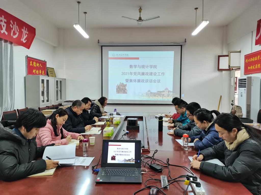 (数学与统计学院 通讯员 耿付荃)3月18日上午,数学与统计学院在学院会议室召开2021年党风廉政建设工作暨集体廉政谈话会。学院领导班子、党支部书记、三办主任、团委书记参加会议,会议由党委书记刘浩主持。