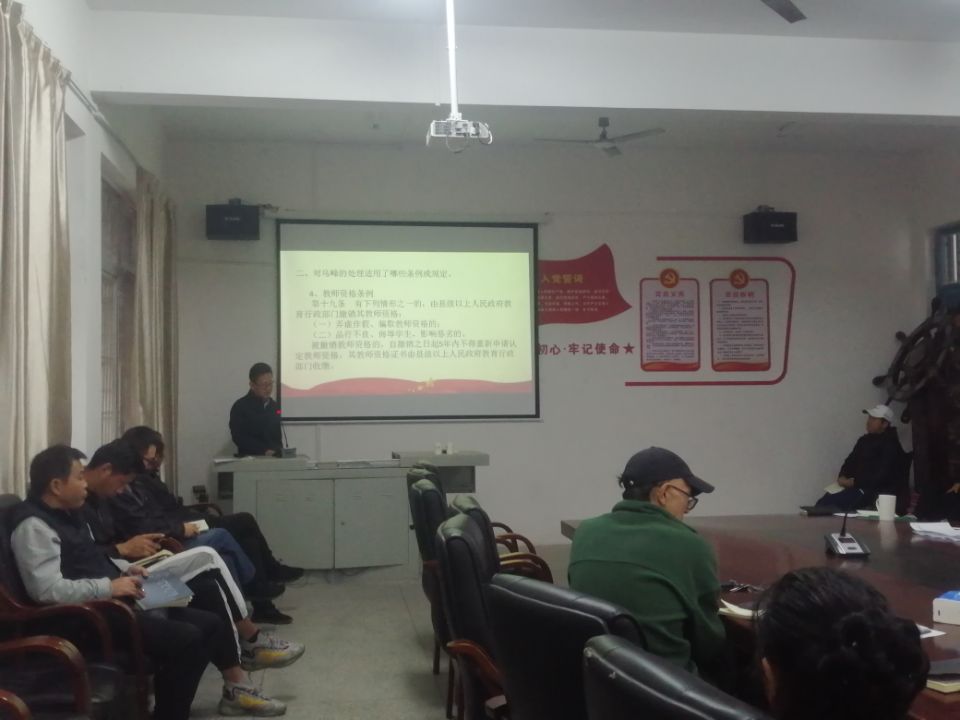 袁红星详细介绍了内蒙古财经大学处理乌峰的5个方面意见,一一剖析乌峰的错误违反《中国共产党纪律处分条例》《事业单位工作人员处分暂行规定》《新时代高校教师职业行为十项准则》和《教师资格条例》的对应条款及处理办法。分析完案例后,袁红星组织大家进一步学习了《新时代高校教师职业行为十项准则》和学校《教师守则》。