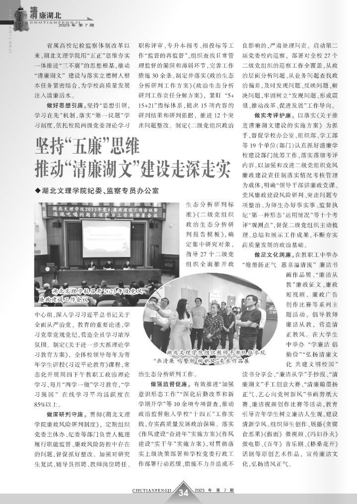 (纪委·监察专员办公室 通讯员 胡旭)近日,湖北省纪委监委主办刊物《楚天风纪》2023年第7期,刊发了学校纪委·监察专员办公室撰写的题为《坚持“五廉”思维 推动“清廉湖文”建设走深走实》的经验文章。
