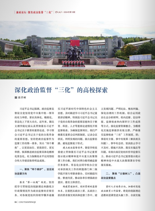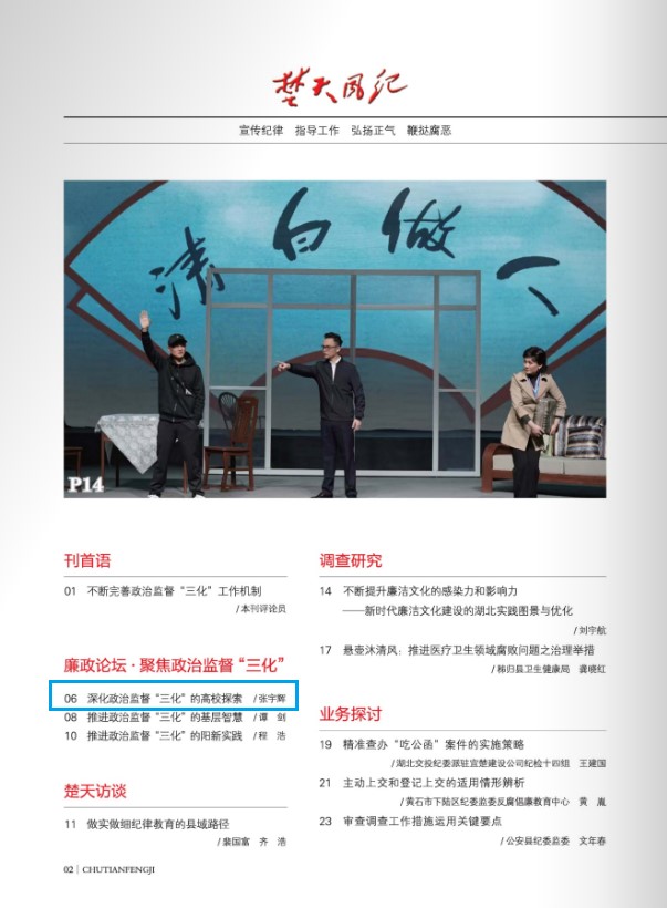 (纪委•监察专员办公室 通讯员 胡旭)近日,学校纪委书记、监察专员张宇辉在中共湖北省纪律检查委员会、湖北省监察委员会主办的《楚天风纪》(2024年第10期)发表署名文章《深化政治监督“三化”的高校探索》。