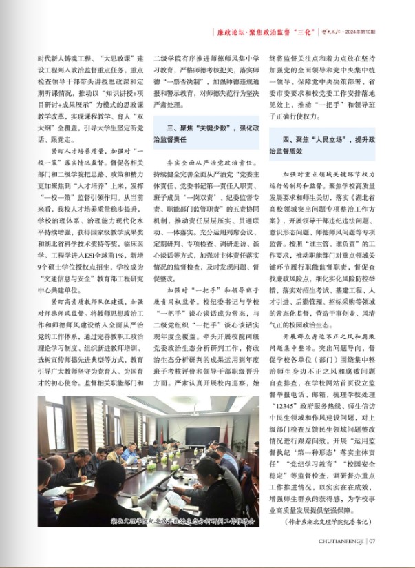 张宇辉的署名文章刊发在“廉政论坛•聚焦政治监督‘三化’”专栏,该文从“聚焦‘两个维护’,坚定政治监督方向”“聚焦‘立德树人’,凸显政治监督重点”“聚焦‘关键少数’,深化政治监督责任”“聚焦‘人民立场’,提升政治监督质效”等四个方面,介绍了学校纪委•监察专员办公室学习领会习近平总书记关于党的自我革命的重要思想,纵深推进政治监督具体化精准化常态化的经验做法。
