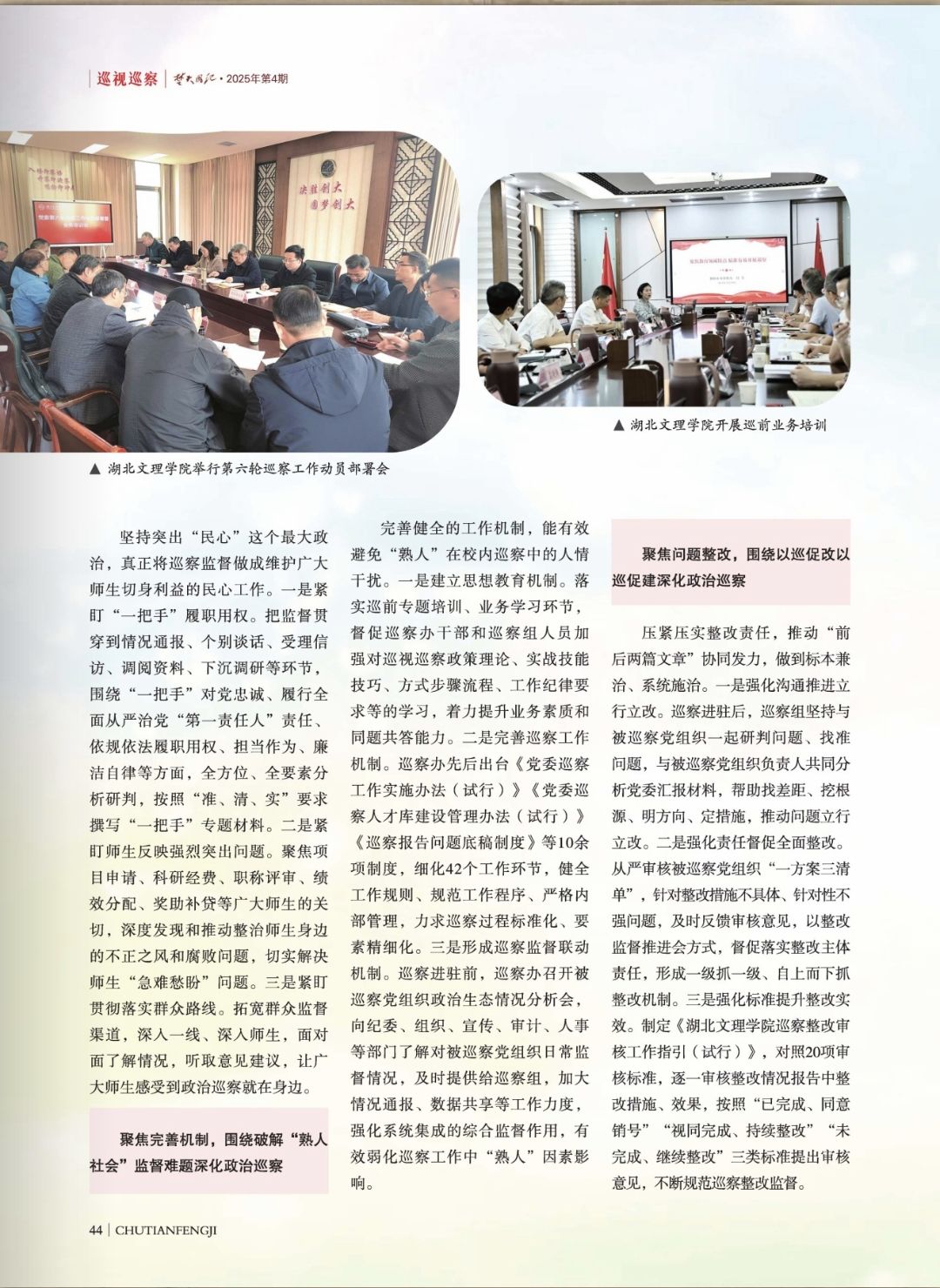(纪委·监察专员办公室 通讯员 胡旭)近日,中共湖北省纪律检查委员会、湖北省监察委员会主办的刊物《楚天风纪》(2025年第4期),刊发了学校校内巡察工作经验文章《构建政治巡察靶向破题矩阵》。